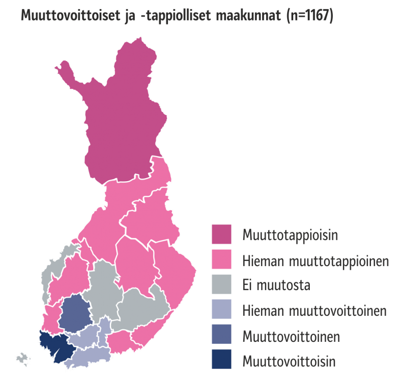 Karttakuvasta selviää, miten teollisuusliiton jäsenet ovat muuttaneet maakunnasta toiseen työn perässä. Muuttovoittoiset maakunnat ovat niitä, joihin muutetaan enemmän kuin niistä muutetaan pois. Eniten teollisuusliittolaiset muuttavat Varsinais-Suomen ja Pirkanmaan maakuntiin, joissa sijaitsee useita metalliteollisuuden keskittymiä. Muuttotappiosta kärsivät maakunnat ovat niitä, joissa poismuuttajia on enemmän kuin tulijoita. Eniten liiton jäsenet lähtevät pois Lapin maakunnasta.