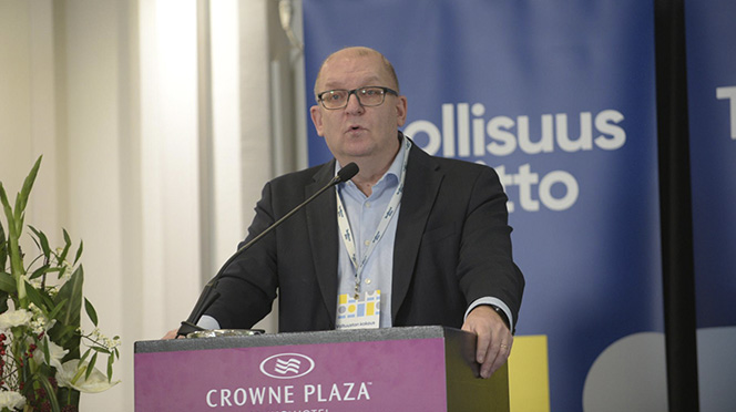 Industrifackets ordförande Riku Aalto inledde sitt anförande med att gratulera den tidigare verksamhetsledaren för arbetsgivarorganisationen Teknologiindustrin rf. Minna Helle till valet till verkställande direktör för Finlands näringsliv EK.