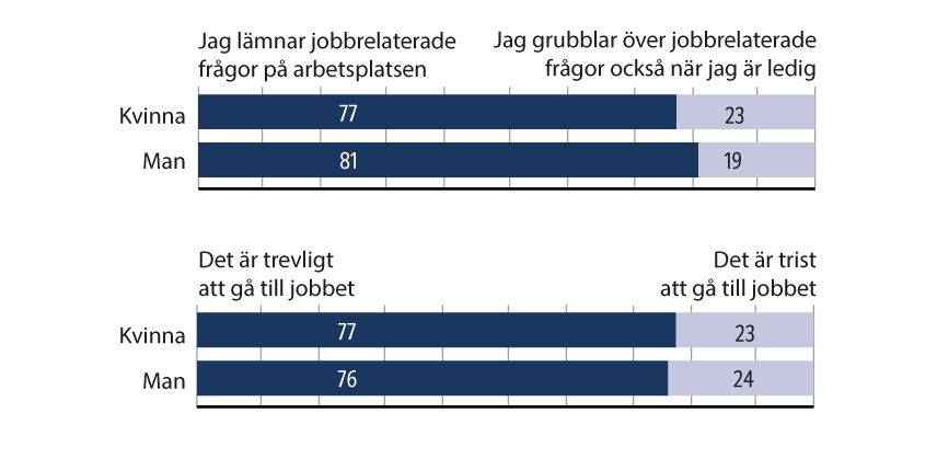 En fjärdedel av kvinnliga medlemmar är bekymrade över arbetsfrågor också när de är lediga, medan färre män upplever detta. Även arbetstidsformen påverkar. Skiftarbetare lämnar arbetet på arbetsplatsen klart oftare än dagsarbetare.