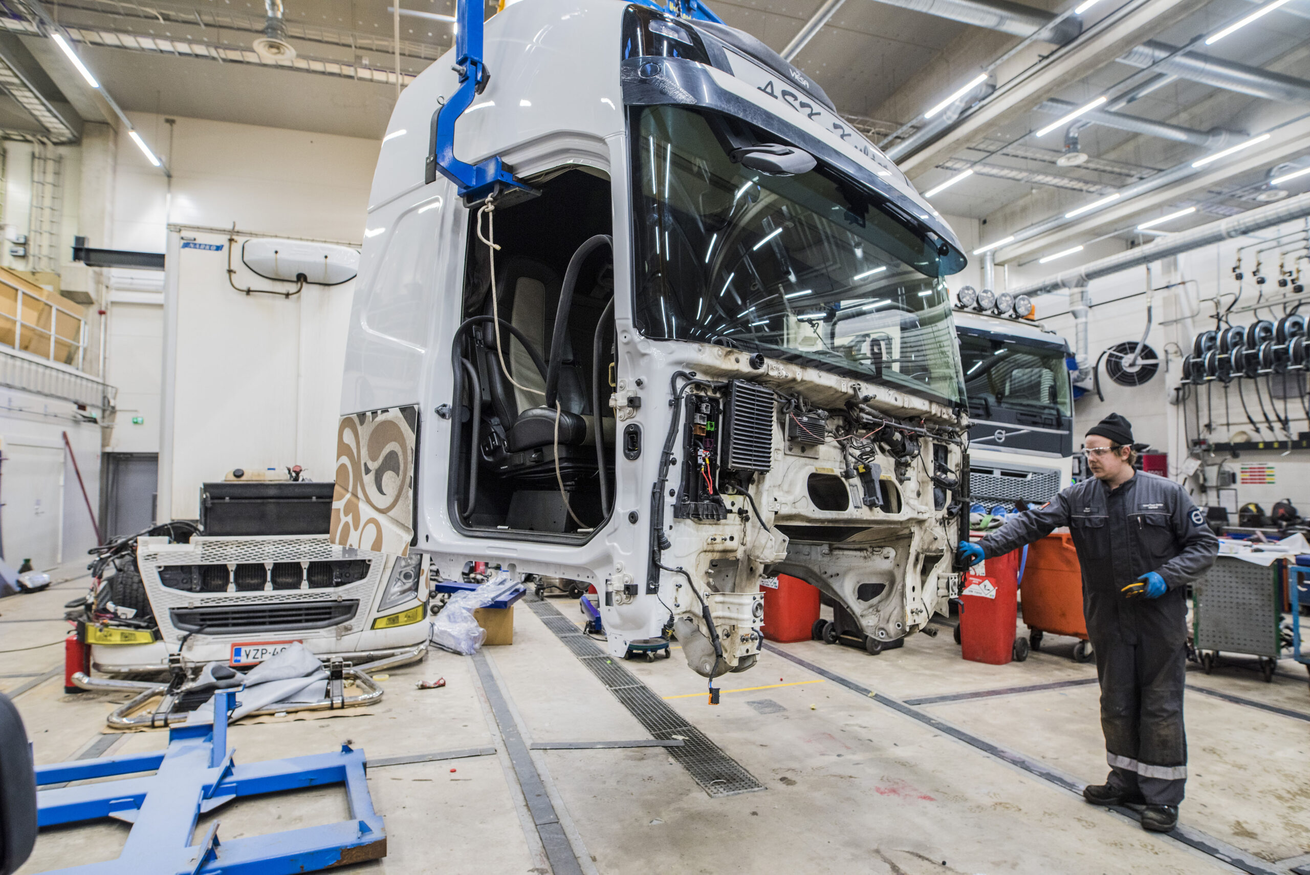 Edellinen Seuraava Volvo Truck Center Vantaa Sami Velasco korjaa kuorma-autoa Volvo Truck Centerissä. KUVA: Sami Perttilä
